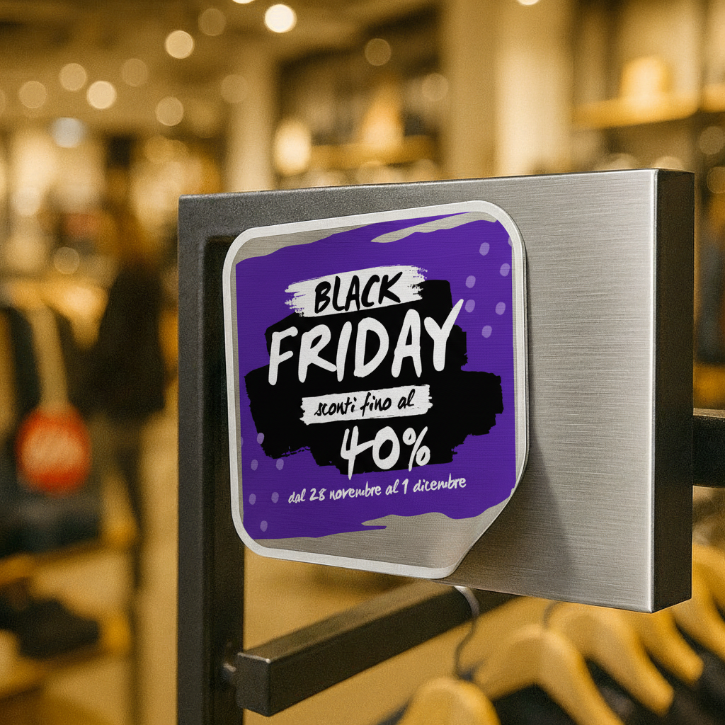 Durante eventi come il Black Friday, dove la comunicazione deve essere immediata e accattivante, i supporti magnetici sono una risorsa fondamentale. Rispetto ad adesivi permanenti, i magneti hanno il vantaggio di poter essere applicati e rimossi in pochi secondi, senza danneggiare la superficie o lasciare residui di colla.